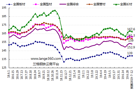 2019年第27周(2019.7.1-7.5)兰格钢铁全国钢材综合价格指数达到153.5点,较上周上升0.74%,较去年同期下降3.84%。其中,LGMI长材价格指数为168.3点,较上周上升1.10%,较去年同期下降0.46%;LGMI型材价格指数为161.9点,较上周上升0.51%,较去年同期下降1.19%;LGMI板材价格指数为139.1点,较上周上升0.45%,较去年同期下降7.47%;LGMI管材价格指数为159.9点,较上周上升0.62%,较去年同期下降3.20%。