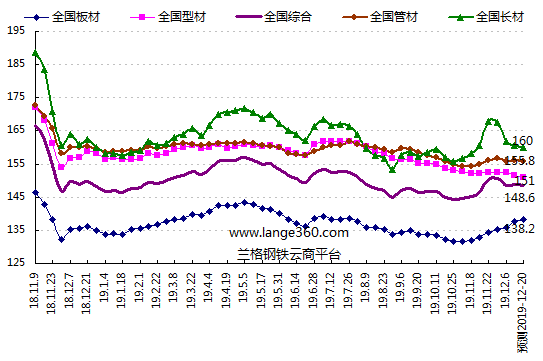 2019年第50周(2019.12.9-12.13)兰格钢铁全国钢材综合价格指数达到148.8点,较上周上升0.15%,较去年同期上升0.44%。其中,LGMI长材价格指数为160.5点,较上周下降0.81%,较去年同期上升0.16%;LGMI型材价格指数为151.7点,较上周下降0.52%,较去年同期下降3.00%;LGMI板材价格指数为137.6点,较上周上升1.20%,较去年同期上升1.89%;LGMI管材价格指数为156.0点,较上周上升0.14%,较去年同期下降2.41%。