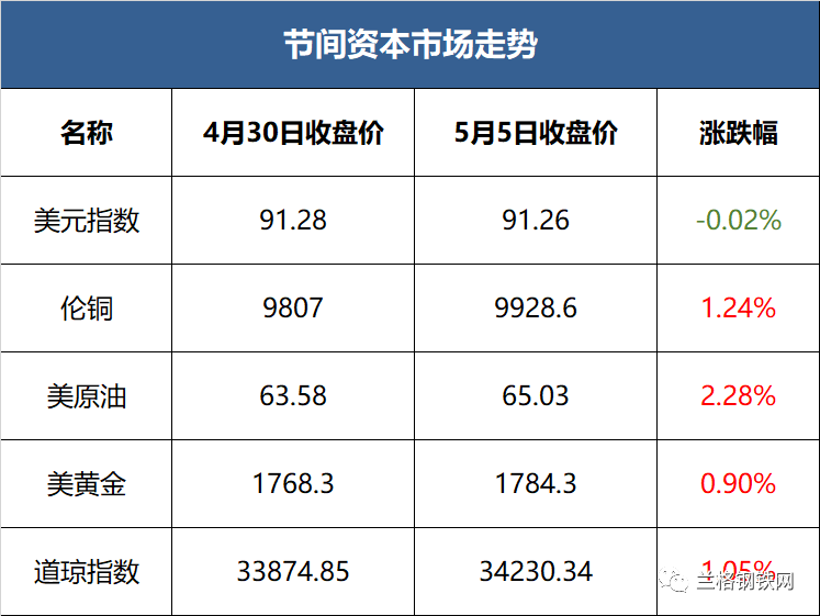 --巴西央行将基准利率从2.75%上调至3.50%,符合市场预期。巴西央行:预计下次会议上将再次进行同样规模的政策调整,较高的财政风险继续造成通胀风险平衡的向上不对称。--美国财政部将计划进行的季度长期国债标售规模保持在纪录高位,以向政府连续不断的经济刺激支出提供资金。这是一年多以来季度再融资规模首次没有提高,表明融资需求已经达到顶峰。财政部强调,当前暂免债务上限的措施将于7月末到期,如果届时国会不能再次暂免或者提高联邦债务上限,将可能带来挑战。--央行发文称,初步测算,2021年一季度我国宏观杠杆率为276.8%,比上年末低2.6个百分点。预计今年宏观杠杆率将保持基本稳定。--近日,各地陆续公布一季度财政收支数据,多地财政收入出现恢复性增长,收入规模已恢复至疫情前水平。一季度,地方财政收入大部分地区实现两位数增长,不少地方出现20%以上的高增长。--中钢协:钢铁进出口关税调整,凸显出了减少对进口铁矿石依赖、改善国内钢铁供需关系、参与高水平国际合作竞争、压减粗钢产量和降能减排四点政策导向。--4月,我国重卡市场预计销售各类车型19.8万辆,环比下降14%,同比上涨4%,创造了重卡市场4月份销量的历史新高。今年1-4月,重卡市场累计销售73万辆,比上年同期增长57%。(第一商用车网)--4月份,中国百城新房价格环比涨0.23%,涨幅较上月微扩0.03个百分点。常州、西安、佛山、绍兴、无锡等城市新房环比涨幅居前。--据克而瑞研究中心发布的数据,4月份受5个重点城市首次集中供地的影响,地市热度明显上涨,各大房企拿地积极性有所提升,销售TOP50房企单月拿地金额同比上涨29%。这5个首次集中供地的城市分别为广州、重庆、沈阳、长春和无锡,据统计,5个城市累计成交地块155宗,成交金额超过2000亿元。--今年,川渝将合作共建67个重大项目,总投资15673.8亿元。这些重大项目中,续建项目47个、新开工项目20个,年度计划完成投资1015.7亿元。其中,重大交通基础设施项目24个、总投资4917.4亿元,年度计划完成投资266.7亿元。主要包括成达万、成渝中线、渝西、渝昆等4个高铁项目,南充至潼南、内江至大足、开江至梁平等9个高速公路项目,嘉陵江利泽航运枢纽工程等11个项目。版权声明:本内容系兰格钢铁网编辑、整理,转载需经授权,若需授权必须与兰格钢铁网与作者本人取得联系并获得书面认可,并注明来源。如果私自转载,兰格钢铁网保留一切追诉的权力,直至追究私自转载者的法律责任。