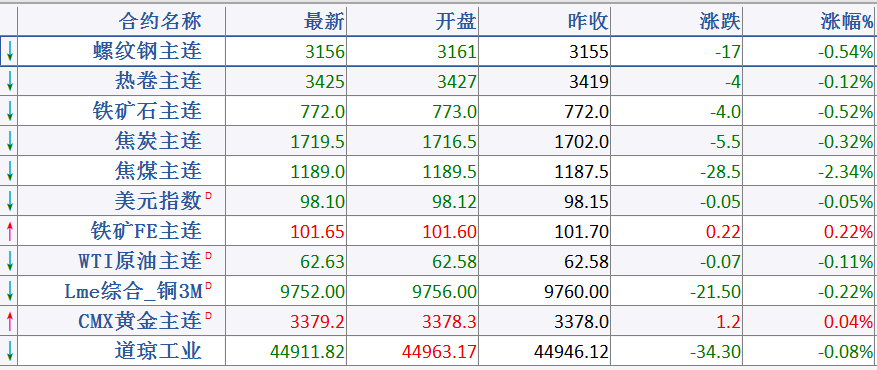 夜盘黑色商品整体收跌,其中主力焦煤跌2.34%,焦炭、铁矿石、螺纹和热卷跌幅不足0.6%,整体继续窄幅回落调整,但多数尚未跌破上一日最低价,日内继续观察上一日低点支撑。目前看,减产影响一般,在政策降低投机度以及终端需求较弱的情况下,市场信心不稳,行情反复,仍会继续震荡调整。参考运行区间:螺纹10合约3130-3203,热卷10合约3380-3465。