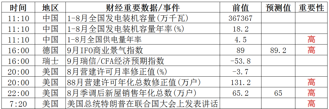 2、美国9月标普全球制造业PMI初值为52,预期52,8月终值53。服务业PMI初值为53.9,综合PMI初值为53.6,均低于预期并创三个月新低。