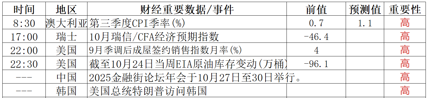 8、本周美联储、欧洲央行、日本央行将在北京时间10月30日公布利率决议。目前市场普遍预计,三大央行将走出分化路线:美联储大概率继续降息25个基点;欧日央行则维持现有利率不变。这种货币政策差异,也成为影响全球汇市走向的关键因素。