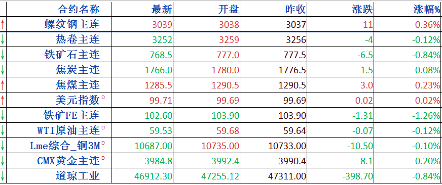 夜盘黑色系商品涨跌互现,主力焦煤、螺纹微涨,其余品种微跌。螺纹主力因资金减仓呈现略强状态,本质没有变化,目前市场运行仍然偏弱,缺乏利好驱动条件。短期看,煤焦整体趋强,和钢材走势有所分化,铁矿偏于稳定,没有大幅波动。整个黑色链条没有形成一致方向,彼此牵制,需要继续等待钢材市场供需矛盾调节。日内继续震荡对待。日内参考运行区间:螺纹01合约3009-3080,热卷01合约3218-3290。