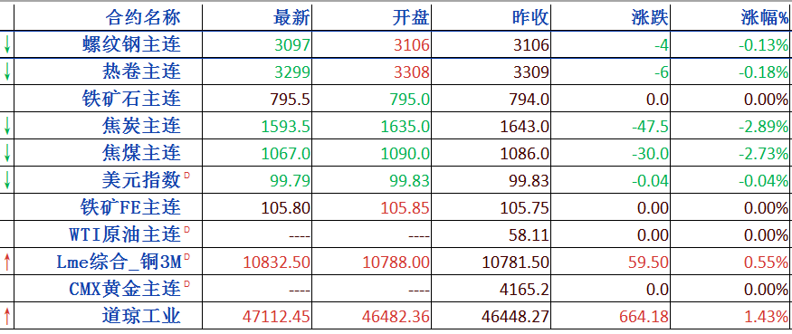 夜盘黑色系商品多数收跌,主力合约中焦煤、焦炭跌幅均超2%,其他品种窄幅走弱。目前钢市未积累过大矛盾,钢价适当反弹合情合理。不过,行情仍是反弹而非反转,依旧在微薄利润下做低估值修复。目前市场的普遍看法是当前价格风险不高,但盈利空间也有限。下一步,需要继续观察供需演变节奏,以及宏观预期的变化。正值移仓换月之际,期货上也难以形成一致方向,出现单边大涨或者大跌的概率很低。日内震荡对待。日内参考运行区间:螺纹01合约3065-3130,热卷01合约3260-3348。