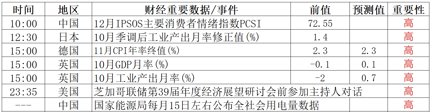 1、中央经济工作会议:明年经济工作抓好以下重点任务:坚持内需主导,建设强大国内市场。深入实施提振消费专项行动,制定实施城乡居民增收计划。增强居民和企业的获得感。优化“两新”政策实施。清理消费领域不合理限制措施,释放服务消费潜力。推动投资止跌回稳,适当增加中央预算内投资规模等。持续扩大内需、优化供给,做优增量、盘活存量,因地制宜发展新质生产力,纵深推进全国统一大市场建设。