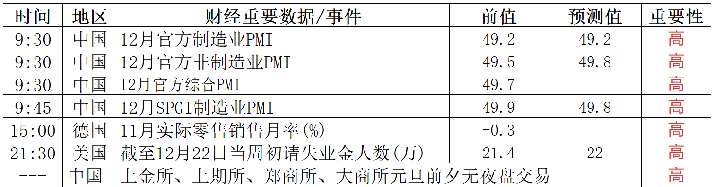 夜盘黑色商品总体运行平稳,主力除了焦煤微涨外,焦炭、铁矿石和螺卷微跌。和上一日收盘价相比,没有偏离过多。当前黑色系受贵金属、有色金属板块情绪扰动明显,叠加元旦假期临近,资金避险情绪升温,市场暂难走出趋势性行情。且假期因素显现,情绪行情为主,市场核心矛盾在于钢铁供需两弱格局未实质改善,1月市场将逐步进入累库周期,不过电炉厂春节多计划停工,产量回升空间有限,节前库存同比仍处低位,自身基本面矛盾不突出,同时缺乏原料负反馈。日内参考运行区间:螺纹05合约3091-3168,热卷05合约3250-3332。