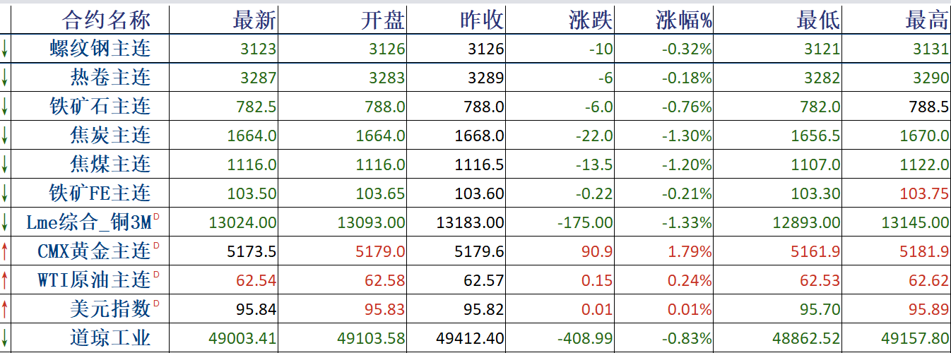 夜盘黑色商品窄幅回落。仍然是主力螺纹、热卷和铁矿跌幅最小,焦炭、焦煤跌超1%。当前钢材市场呈现反弹乏力、节奏偏缓的运行特征,整体维持小波段回落局面。后续需重点跟踪资本市场风向、政策动态及市场情绪变化,同时注意个别市场“爆雷”影响。螺纹日线级别在周一结束反弹之后,陆续出现窄幅回撤,短线或继续下探3100关口,偏弱震荡对待。日内参考运行区间:螺纹05合约3100-3150,热卷05合约3250-3316。