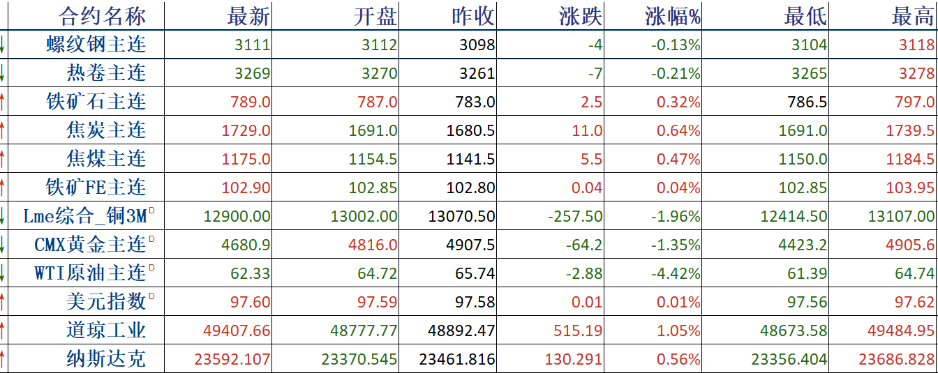 夜盘黑色商品涨跌互现,主力焦煤、焦炭、铁矿石微幅回涨,螺纹、热卷略微收跌。受金银价格略微回涨以及市场情绪缓和影响,钢价未有继续下行,螺纹暂时稳定在3100关口之上。相比贵金属、有色金属等商品,钢材表现相对平稳,大涨大跌都难以见到。随着春节假期临近,现货市场稳定性增强,对盘面也有稳定作用,节前很难出现大行情。震荡对待。日内参考运行区间:螺纹05合约3080-3165,热卷05合约3250-3316。
